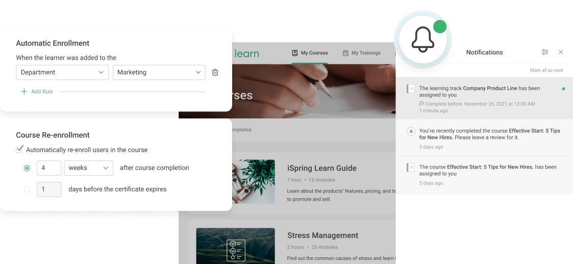 iSpring Learn will automate your eLearning programs. The platform will ensure that new hires are assigned onboarding materials, employees are notified of upcoming deadlines, and testing is regular—eliminate tedious tasks forever in just a few clicks!