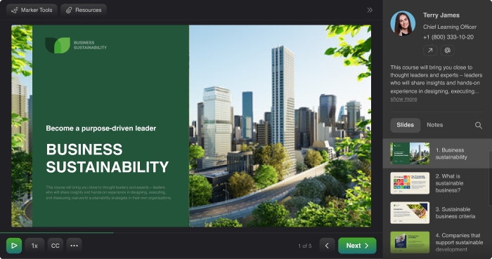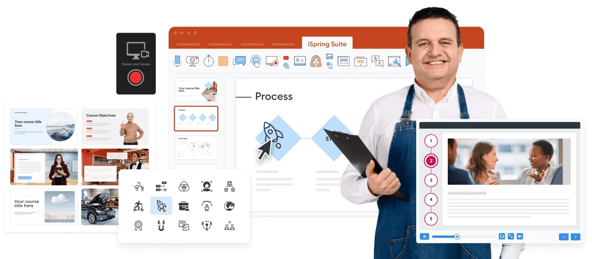 Enhance your powerpoint presentations with training videos, interactive content, and voice overs. Design stunning materials using over 89,000 ready-to-use eLearning assets: templates, characters, locations, objects, buttons, and icons.
