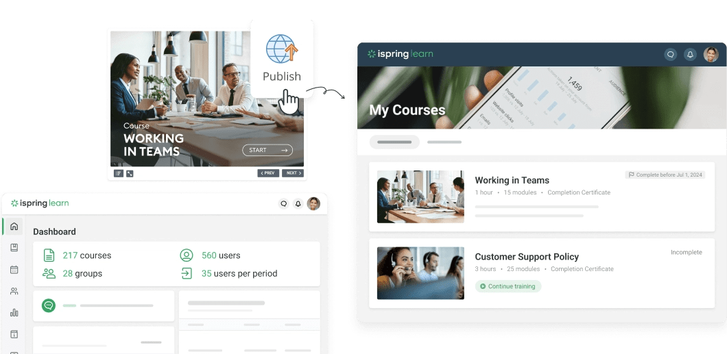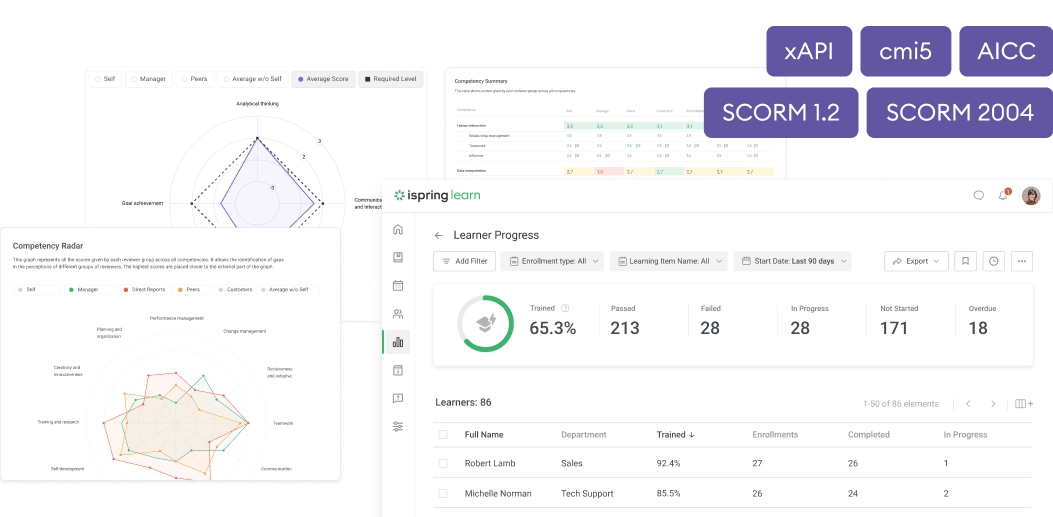 iSpring Suite produces content that can be used in your LMS. iSpring supports classic LMS standards and new eLearning standards: SCORM 1.2, SCORM 2004, AICC, cmi5, and xAPI (Tin Can). If you don’t have an LMS yet, consider using iSpring Learn .